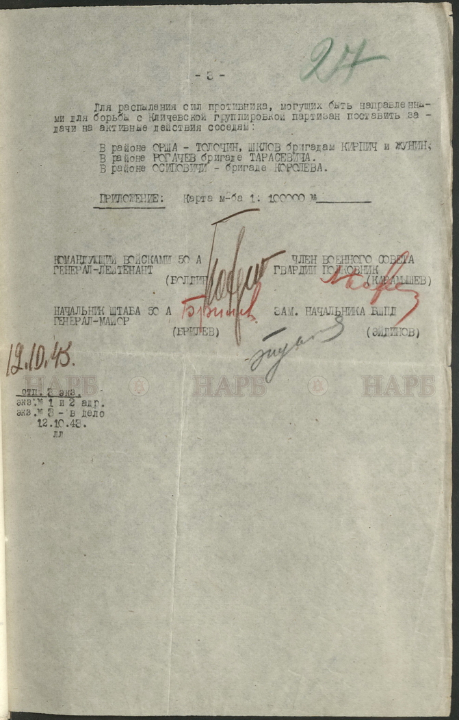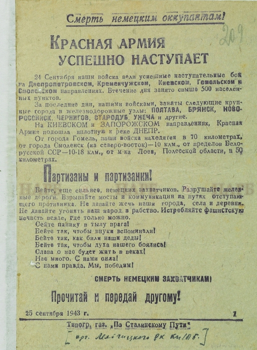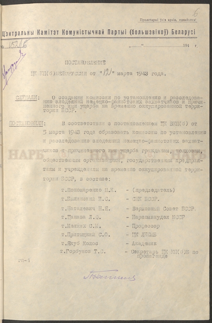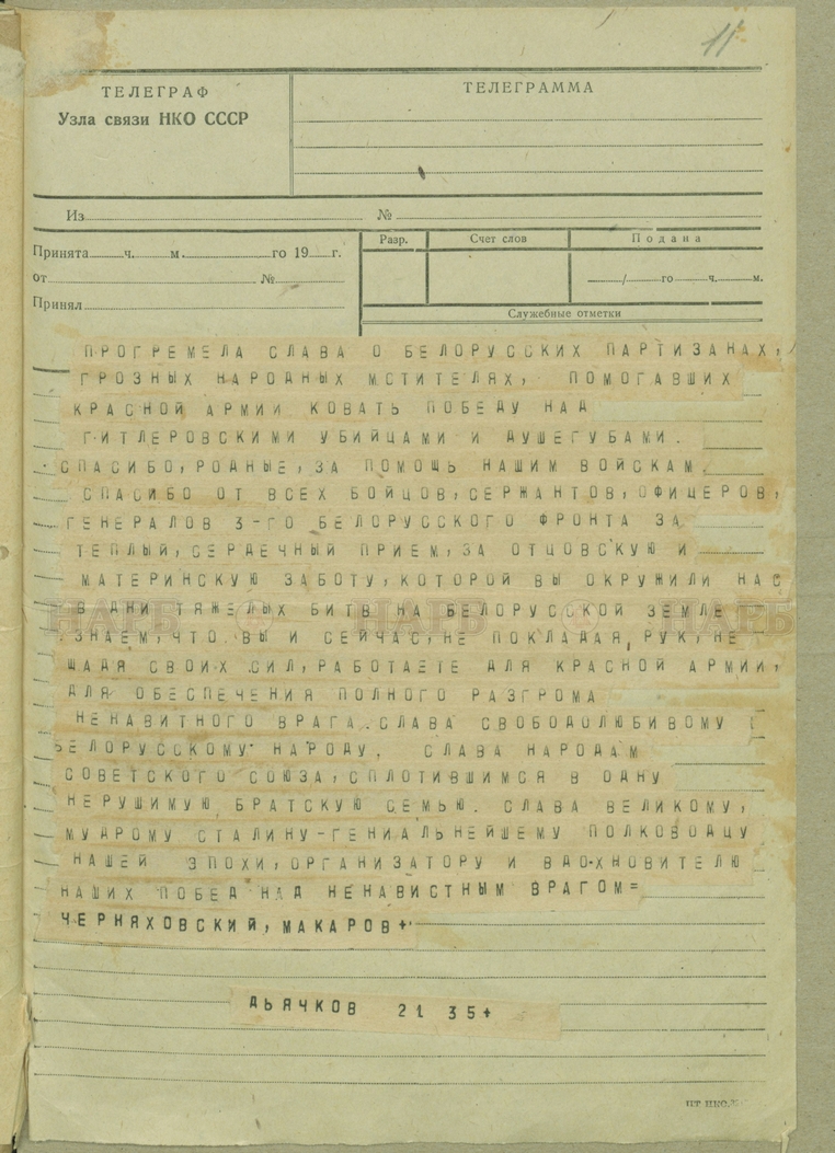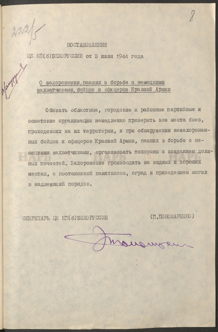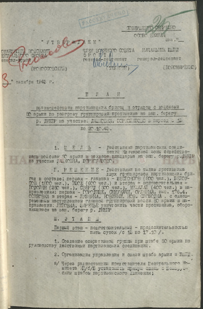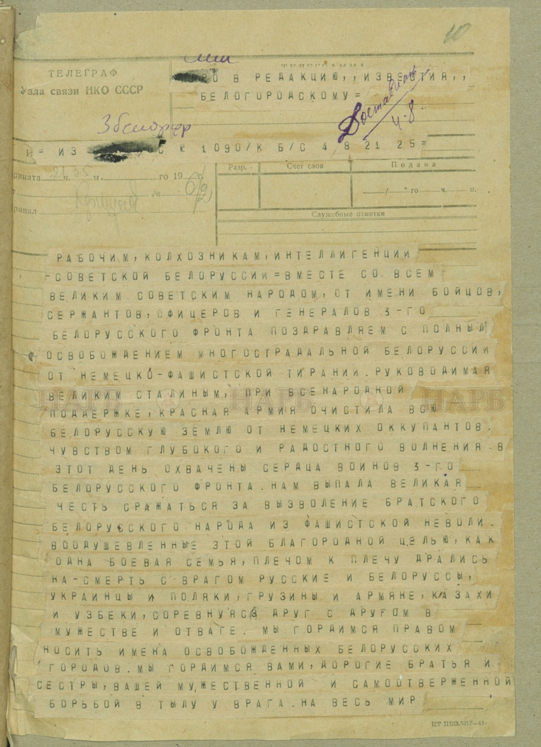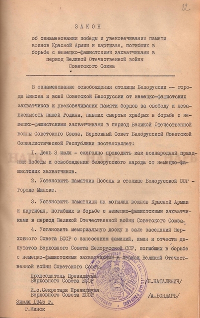 В фондах Национального архива Республики Беларусь хранятся документы Белорусского штаба партизанского движения, ЦК комитета Коммунистической партии Белоруссии, Верховного Совета БССР. Несколько наиболее интересных артефактов представлены в данной публикации.