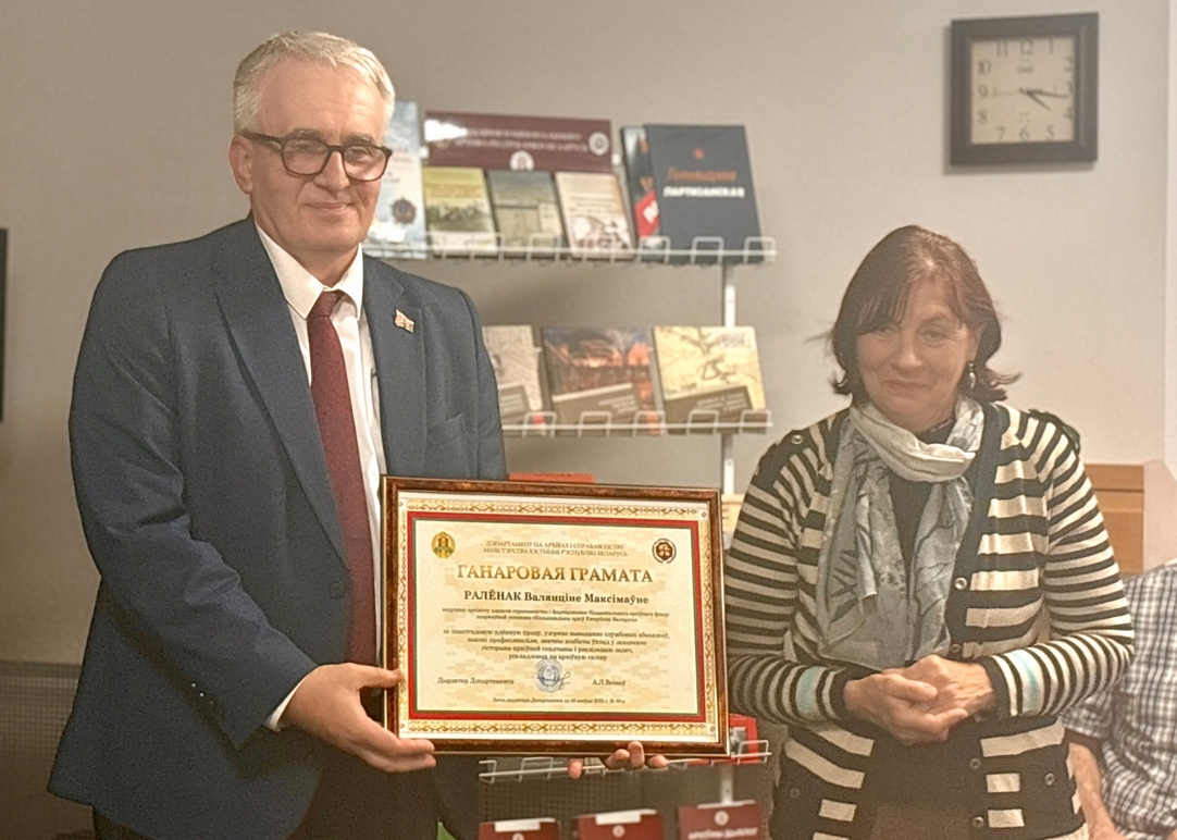 Заместитель директора Департамента по архивам и делопроизводству Министерства юстиции Республики Беларусь А.Е.Цветков за многолетний плодотворный труд, образцовое выполнение служебных обязанностей, высокий профессионализм, значительный личный вклад в обеспечение историко-архивного наследия и реализацию задач, возложенных на архивную отрасль, вручил В.М.Ролёнок Почетную грамоту Департамента.