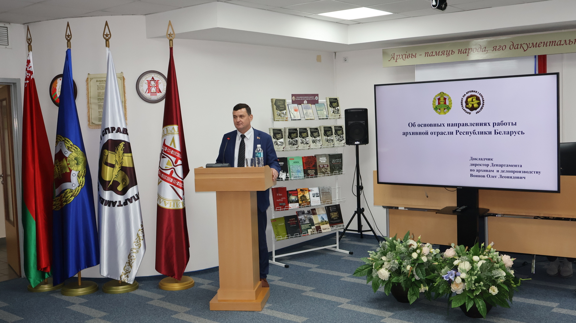 В основной части мероприятия с докладом «О состоянии архивного дела в Республике Беларусь в 2025 году» выступил директор Департамента по архивам и делопроизводству Министерства юстиции Республики Беларусь О.Л.Воинов. Он отметил динамику роста основных показателей в отрасли, подробно остановился на вопросе использования архивных документов. Важное место в докладе директора Департамента по архивам и делопроизводству было отведено вопросу укрепления материально-технической базы архивных учреждений. В заключение О.Л.Воинов информировал присутствующих о проводимой в отрасли работе с молодежью. Он подчеркнул важность оказания всемерной поддержки молодых специалистов и вовлечения их в общественно-культурную жизнь архивных учреждений.