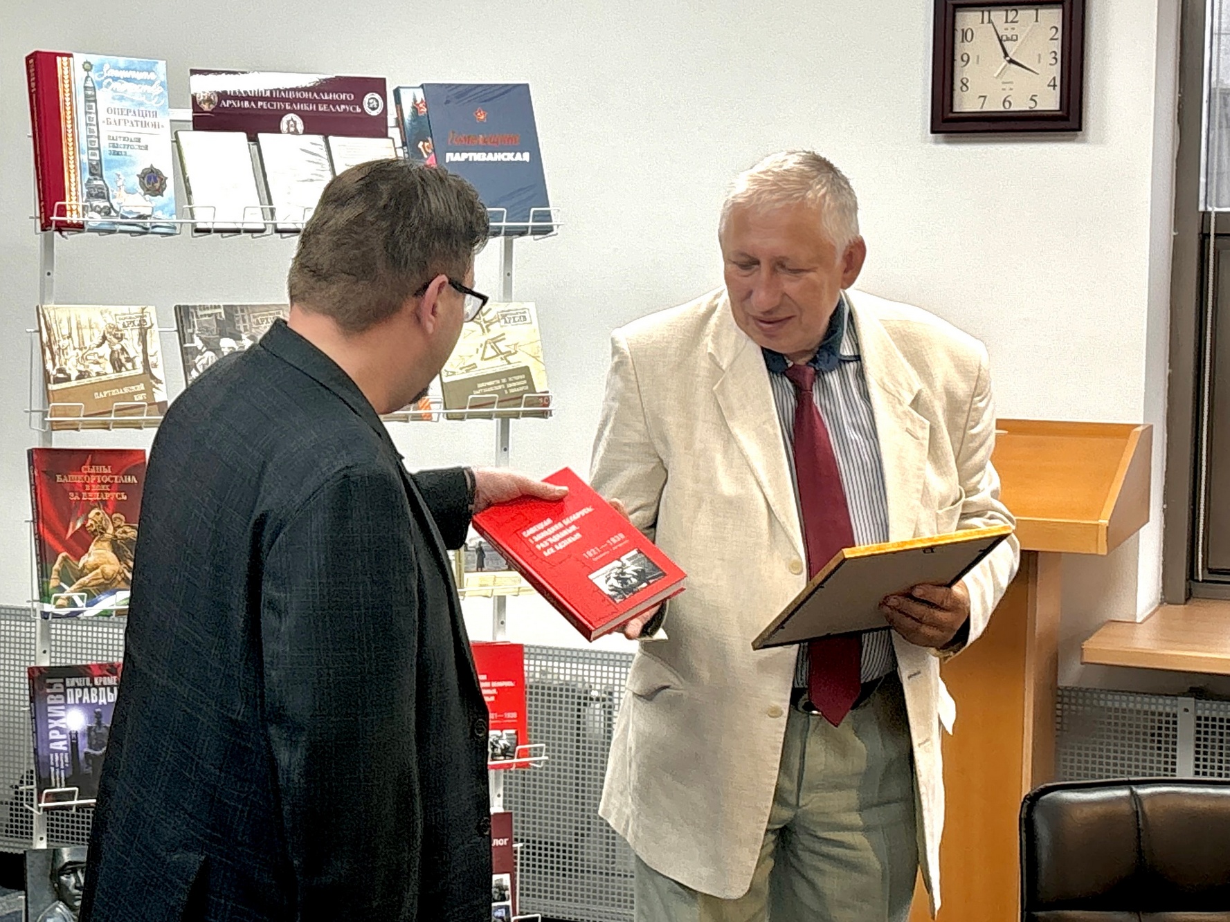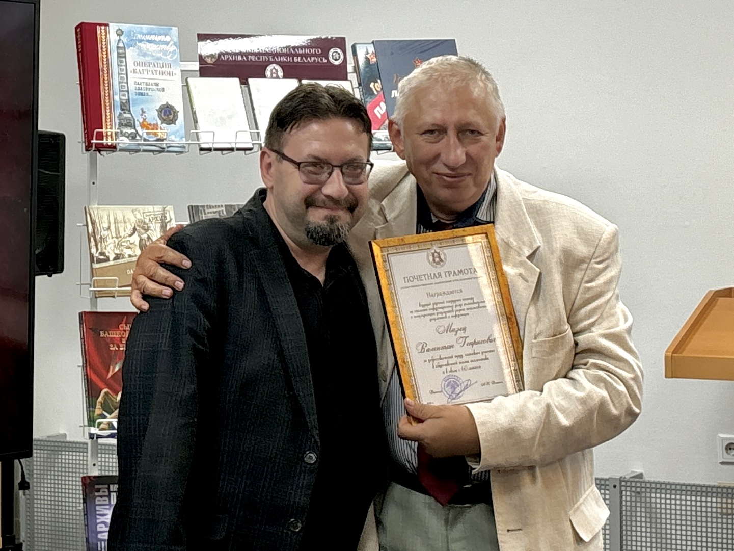 17.09.202516 сентября 2025 года в Национальном архиве Республики Беларусь (далее - НАРБ) состоялось торжественное собрание коллектива, приуроченное ко Дню народного единства. К работникам архива обратилась заместитель директора НАРБ Е.А.Стуканова. Она поздравила коллектив с праздником и отметила вклад НАРБ в сохранение исторической правды. Заместитель директора НАРБ С.В.Кулинок вручил Почетную грамоту и сборник документов ведущему научному сотруднику НАРБ, к.и.н., доценту В.Г.Мазецу, отпраздновавшему накануне 60-летний юбилей.
