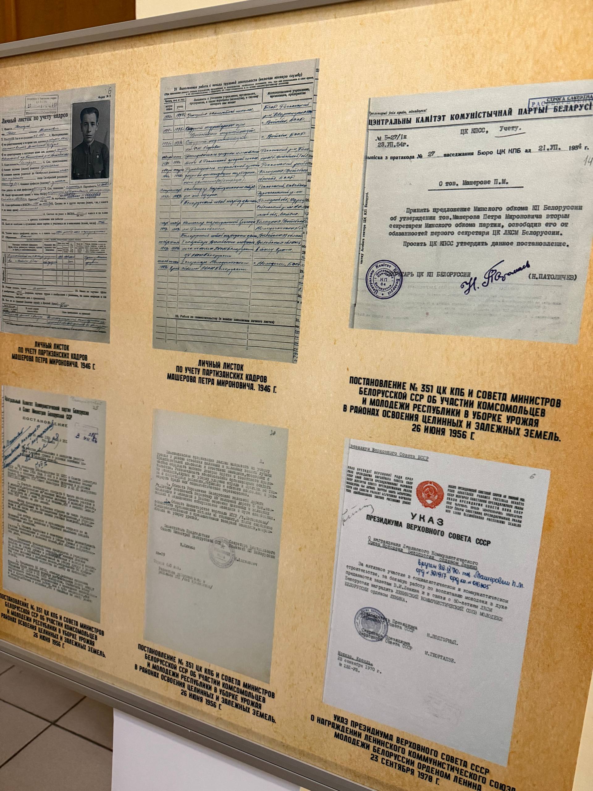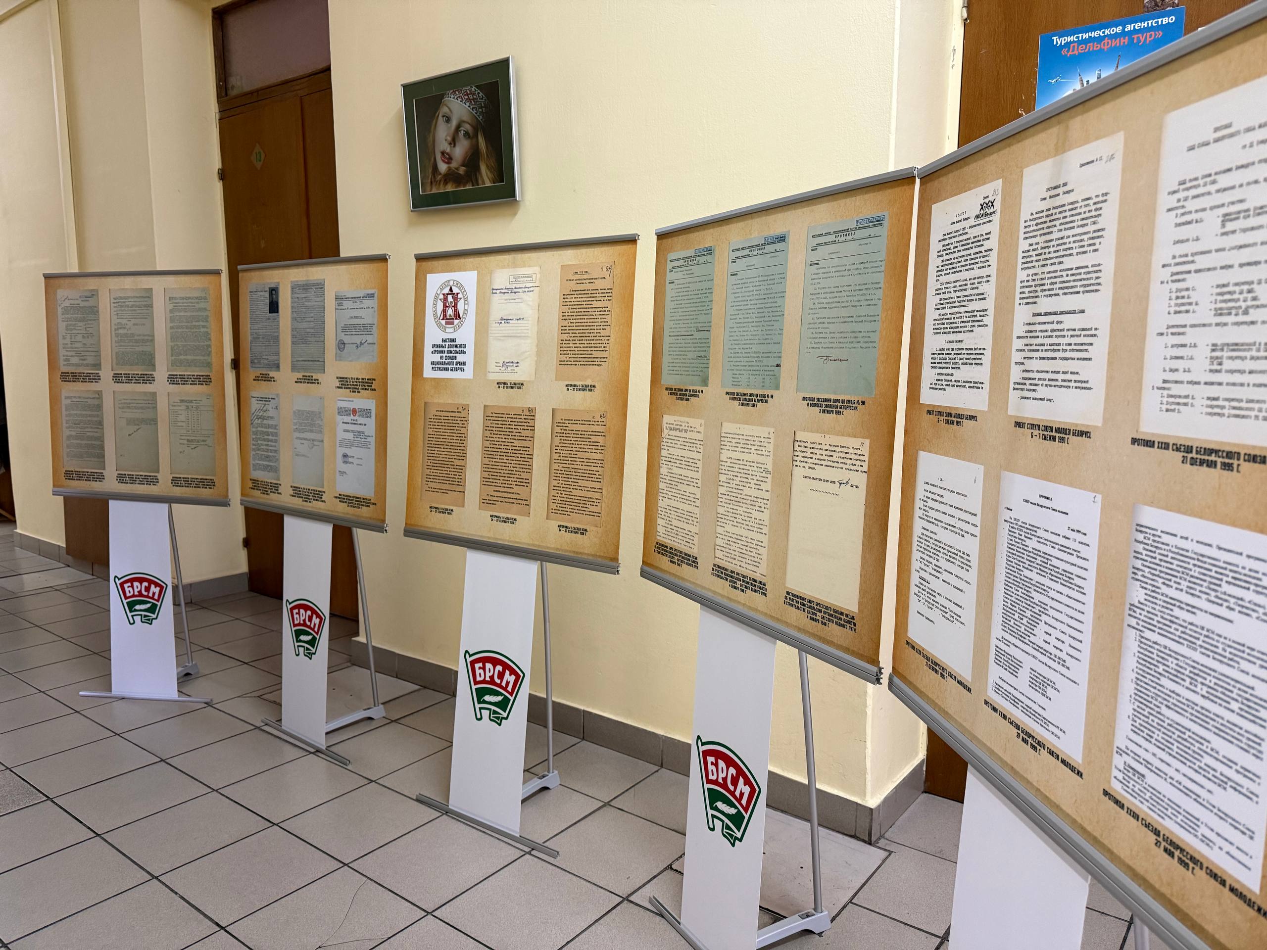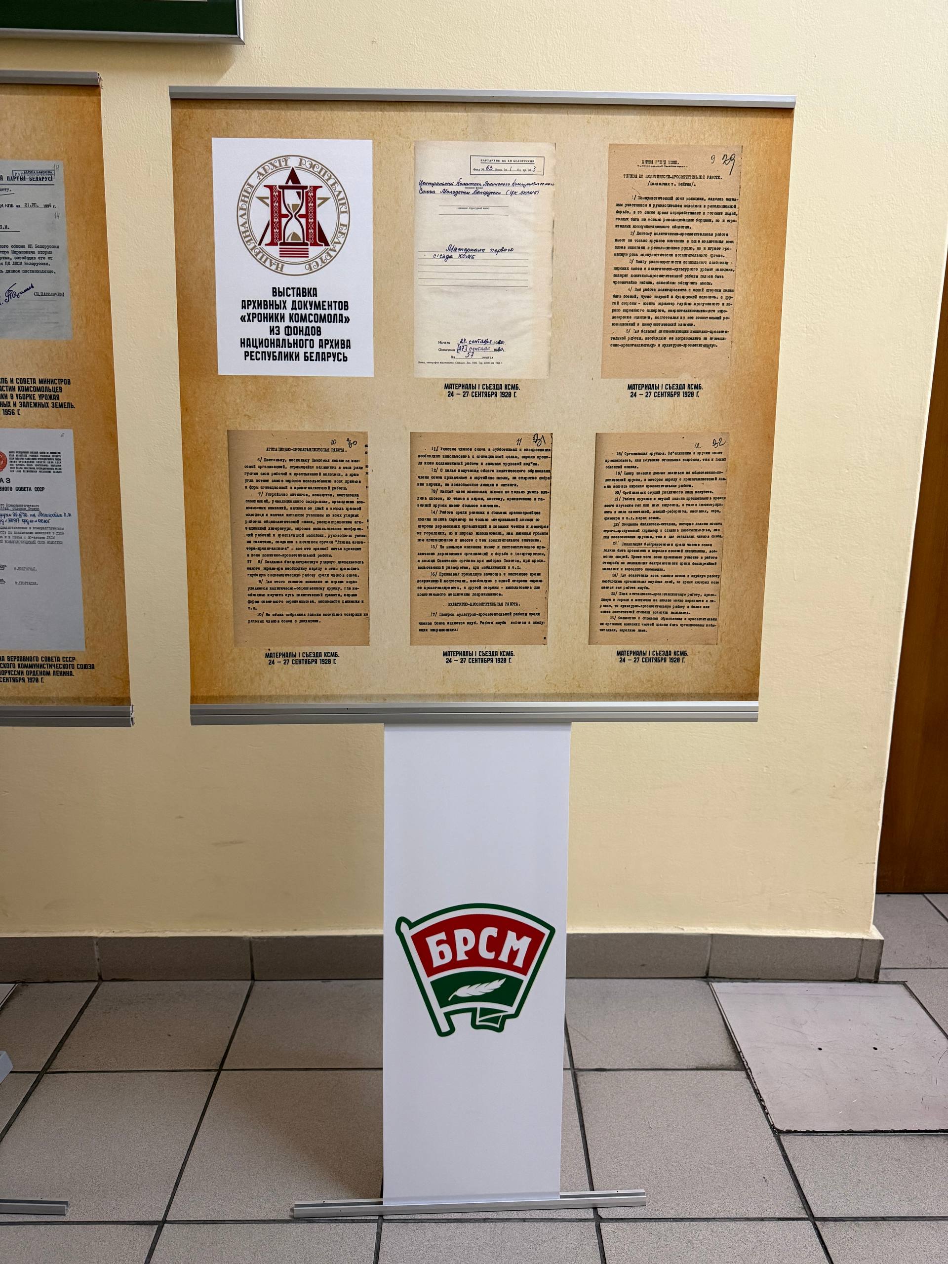 Национальный архив Республики Беларусь представил на выставке уникальные документы, посвященные истории зарождения, становления и развития комсомольского движения в нашей республике: Обращение ЦК КСМБ к молодёжи (1919 г.); Материалы I съезда КСМБ (1920 г.); Пратакол пасяджэння першага Пленуму ЦК ЛКСМБ 8–га склікання (1926 г.); Протокол № 1 заседания секретариата ЦК ЛКСМБ о задачах комсомольских организаций Белоруссии в связи с военной обстановкой от 27 – 28 июня 1941 г.; Протокол № 301 Бюро ЦК КП(б) Белоруссии о представлении к правительственным наградам орденами СССР работников комсомольских организаций Белорусской ССР (1945 г.); Постановление № 351 ЦК КПБ и Совета Министров Белорусской ССР об участии комсомольцев и молодежи республики в уборке урожая в районах освоения целинных и залежных земель (1956 г.), и другие.