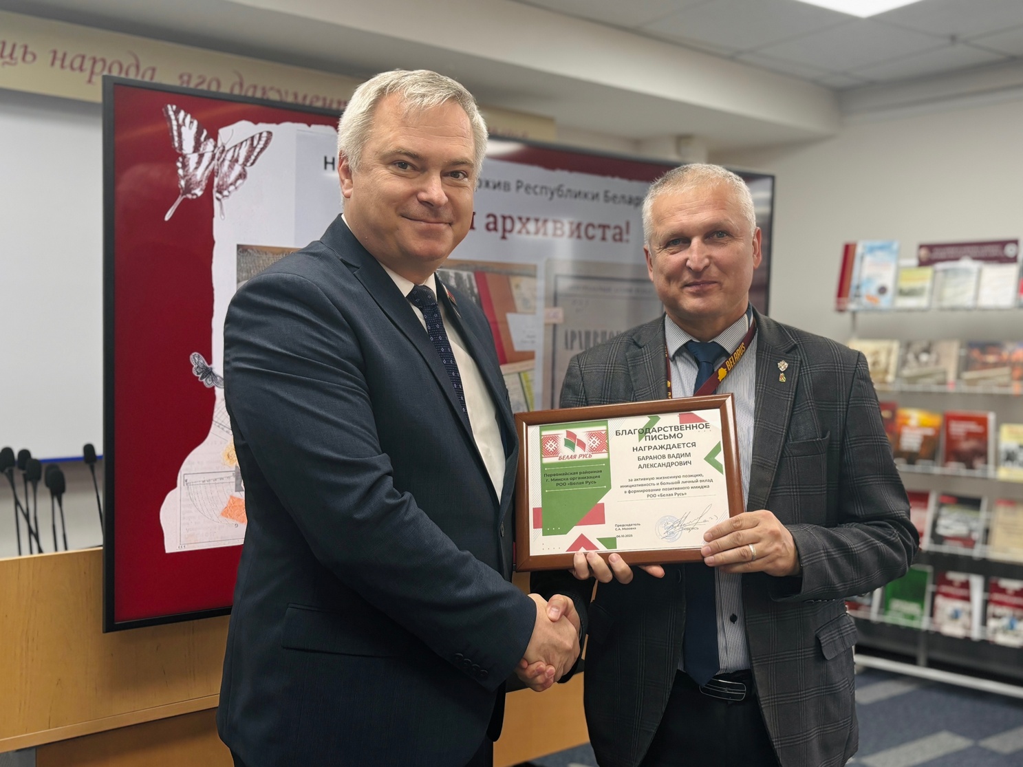 Заместитель председателя Первомайской районной г. Минска организации РОО «Белая Русь» Кузнецов Эдуард Александрович вручил Благодарственное письмо главному инженеру архива Баранову В.А. и поблагодарил коллектив за активное сотрудничество с общественной организацией и большую работу по патриотическому воспитанию населения.