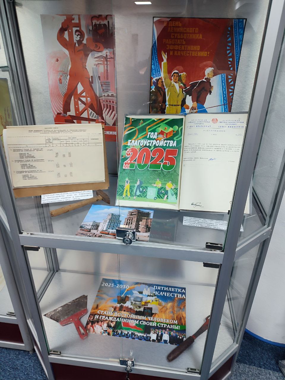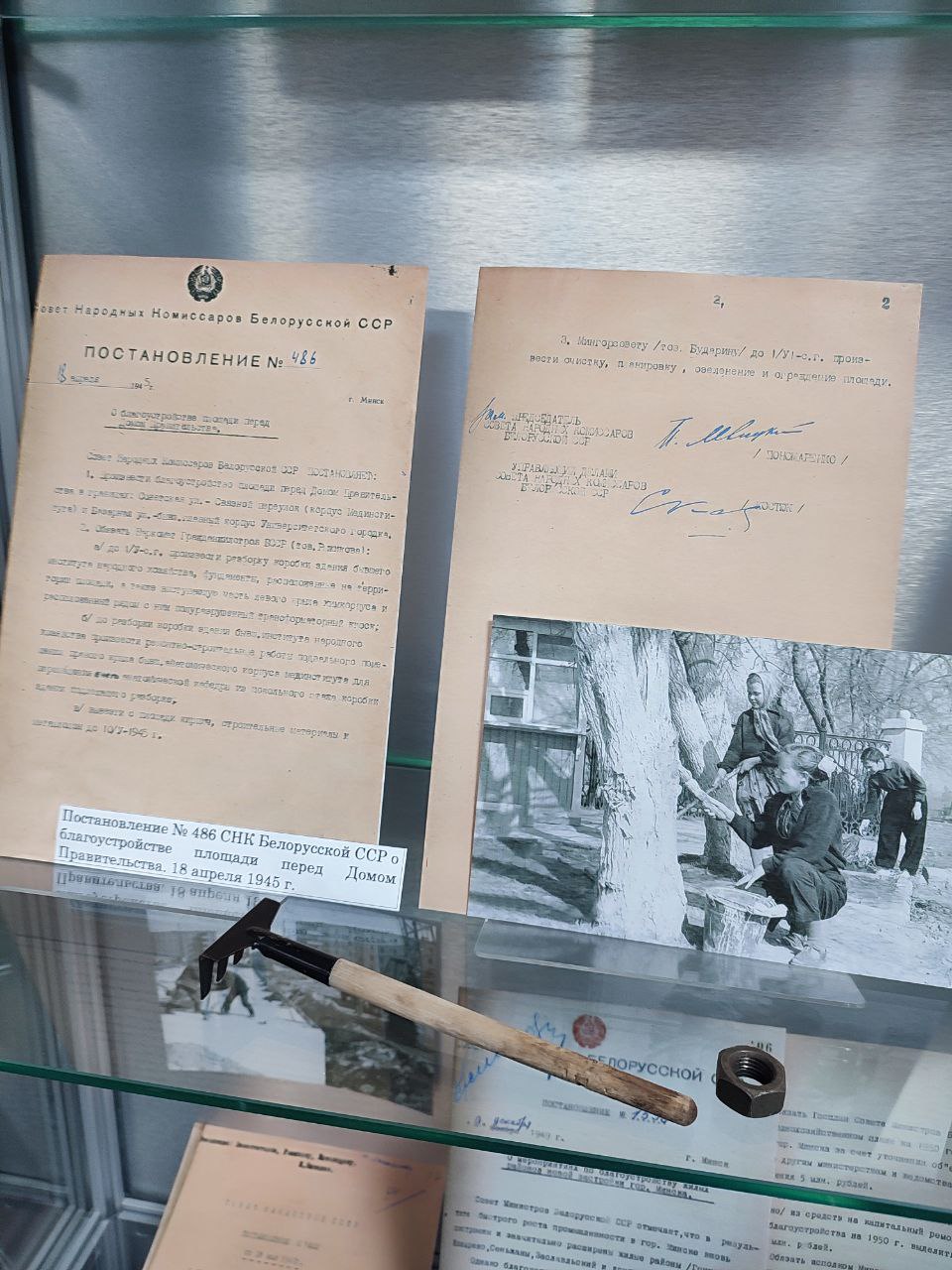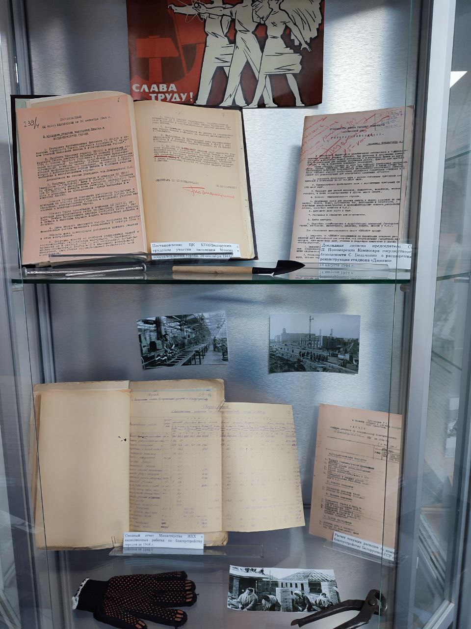 НАРБ представил на выставке подлинные архивные документы за 1945 - 1990 гг.: Постановление ЦК КП(б) Белоруссии о трудовом участии населения Минска в восстановлении города в 1944 г.; Постановления ЦК КПБ и Совета Министров Белорусской ССР о повышении качественного уровня застройки и благоустройства города Минска, титульный список вновь начинаемых объектов на благоустройство улиц в 1971 – 1975 гг.; Распоряжение Совета Министров о выделении облисполкомам средств на благоустройство городов и городских поселков, о выделении средств Минскому облисполкому на реконструкцию и восстановление дворцово-паркового ансамбля в г. Несвиже, и другие документы.