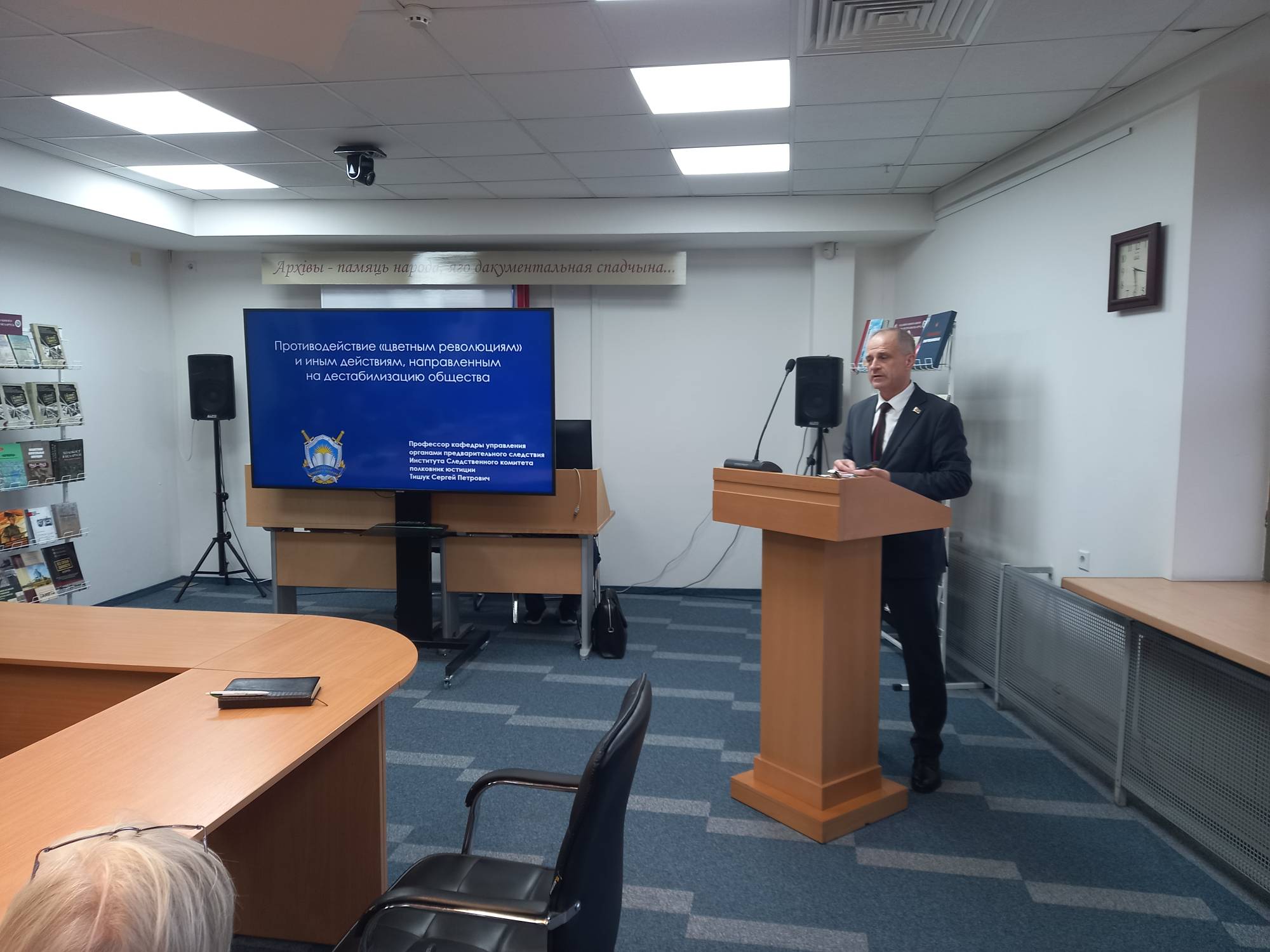 Перед сотрудниками НАРБ выступил профессор кафедры управления органами предварительного следствия Института повышения квалификации и переподготовки Следственного комитета Республики Беларусь полковник юстиции С.П.Тишук. Он прочел лекцию, посвященную противодействию действиям, связанным с финансированием и иным материальным обеспечением экстремистских формирований и организаций, а также иным действиям, направленным на дестабилизацию общества, рассказал о механизме проведения так называемых «цветных революций».