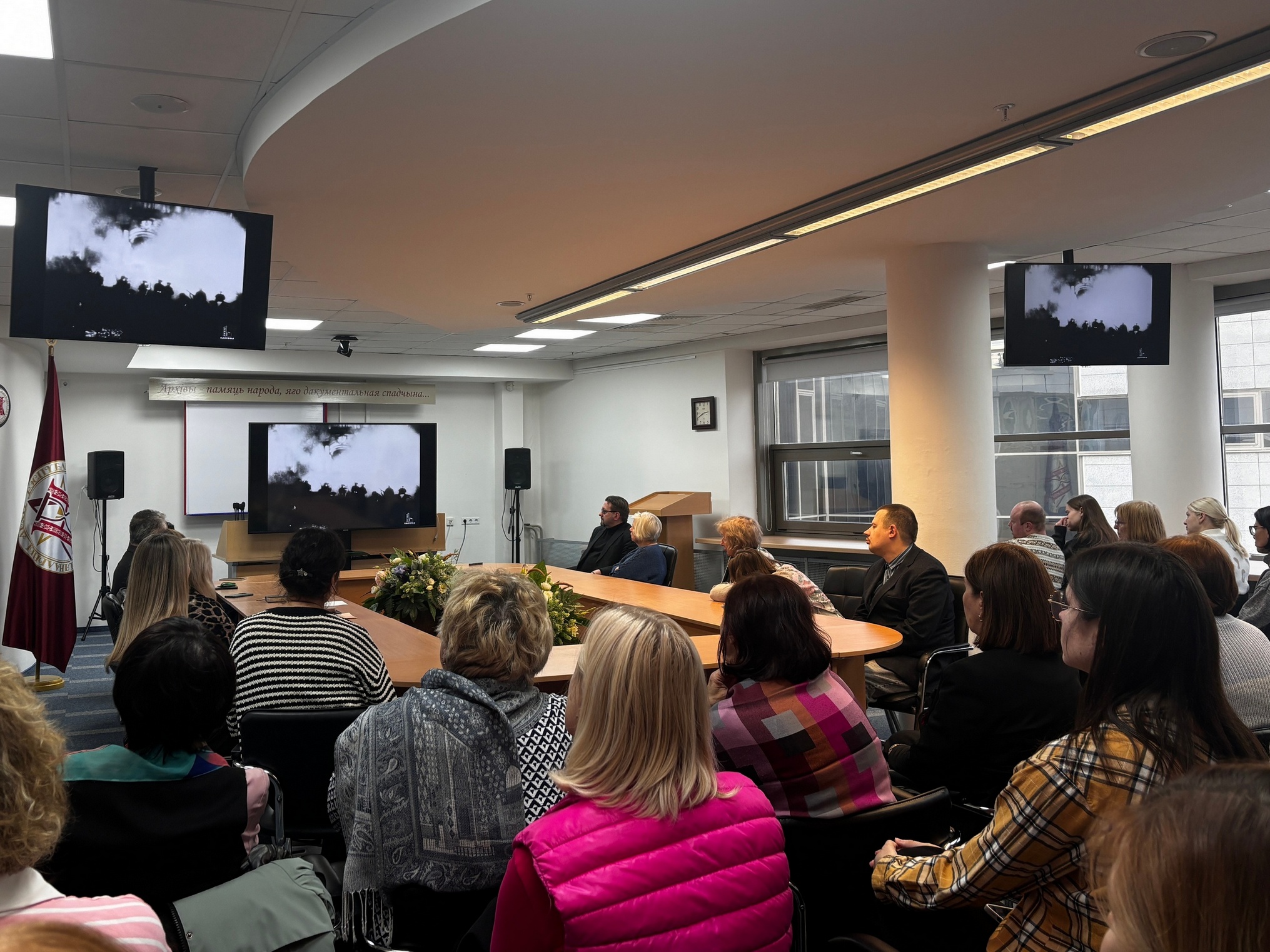 Докладчик представил краткий доклад и презентацию на тему «Документы по истории Октябрьской революции в Беларуси в фондах Национального архива Республики Беларусь». В заключение для собравшихся был продемонстрирован документальный фильм, подготовленный архивистами Белорусского государственного архива кинофотофонодокументов к 7 ноября.