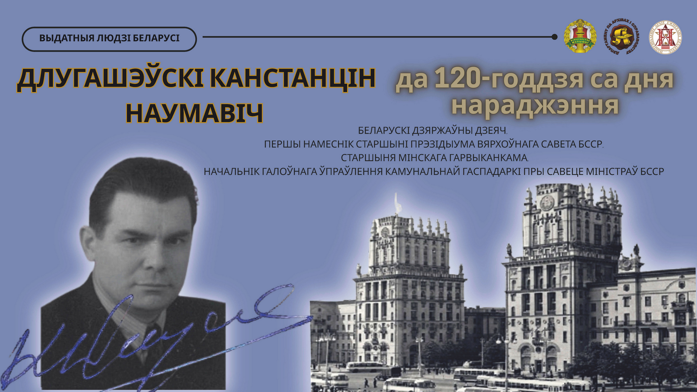 Национальный архив Республики Беларусь представляет виртуальную выставку «Выдатныя людзі Беларусі. Беларускі дзяржаўны дзеяч Канстанцін Наумавіч Длугашэўскі (да 120-годдзя са дня нараджэння)».
