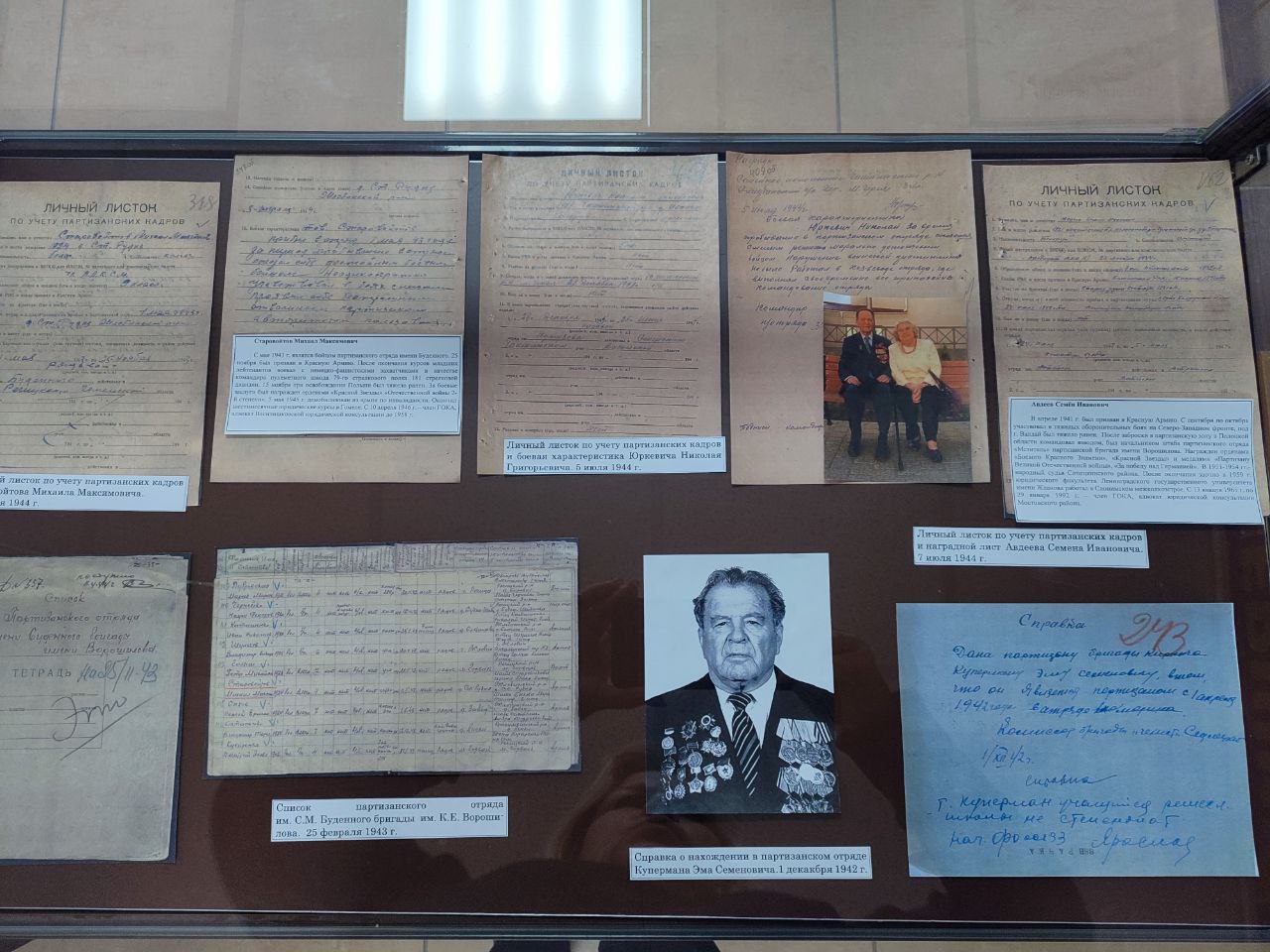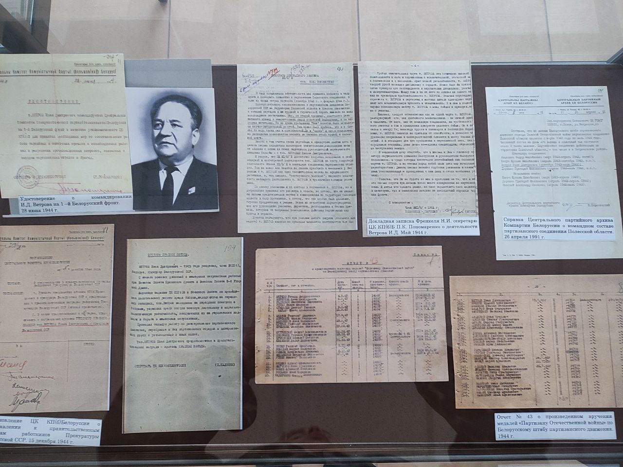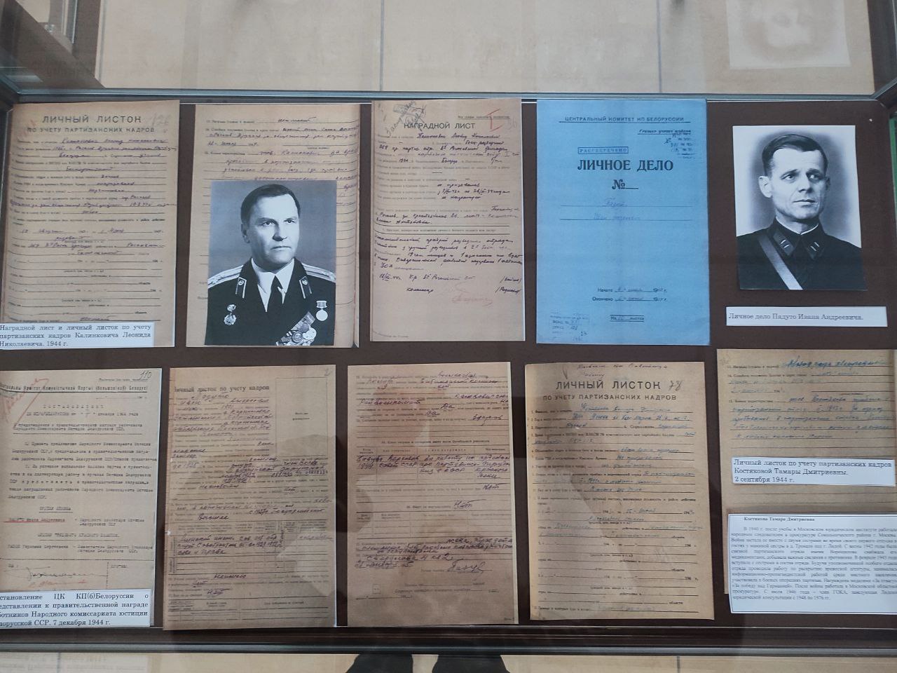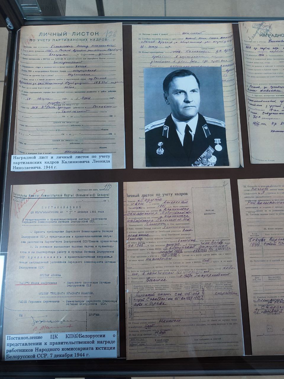 На выставке НАРБ представил архивные документы: личные листки по учету партизанских кадров; боевые и служебные характеристики; наградные листы; Постановление ЦК КП(б) Белоруссии о представлении к правительственной награде работников Народного комиссариата юстиции Белорусской ССР, и другие.