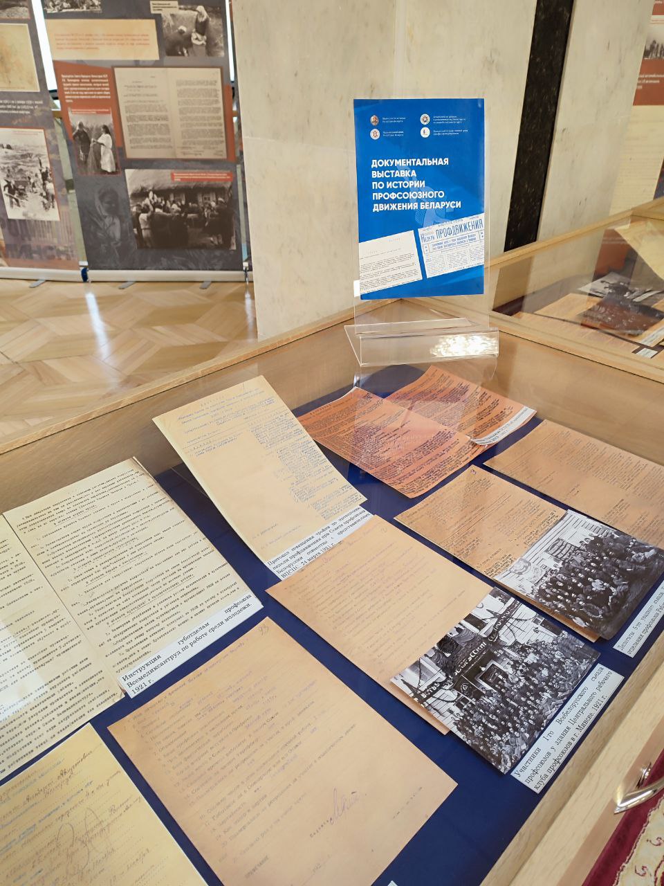 На выставке представлены информативные документы из фондов Национального архива Республики Беларусь: Инструкция губотделам профсоюза Всемедиксантруд по работе среди молодежи; информационная сводка Белорусского республиканского комитета союза сельхозлесрабочих об участии союза в колхозном строительстве и в проведении подготовки к посевкампании; личные анкеты членов Пленума Совета профсоюзов Белоруссии; сводка охвата профсоюзным членством работающих по БССР, а также фотографии по истории профсоюзов из фондов Белорусского государственного архива кинофотофонодокументов.