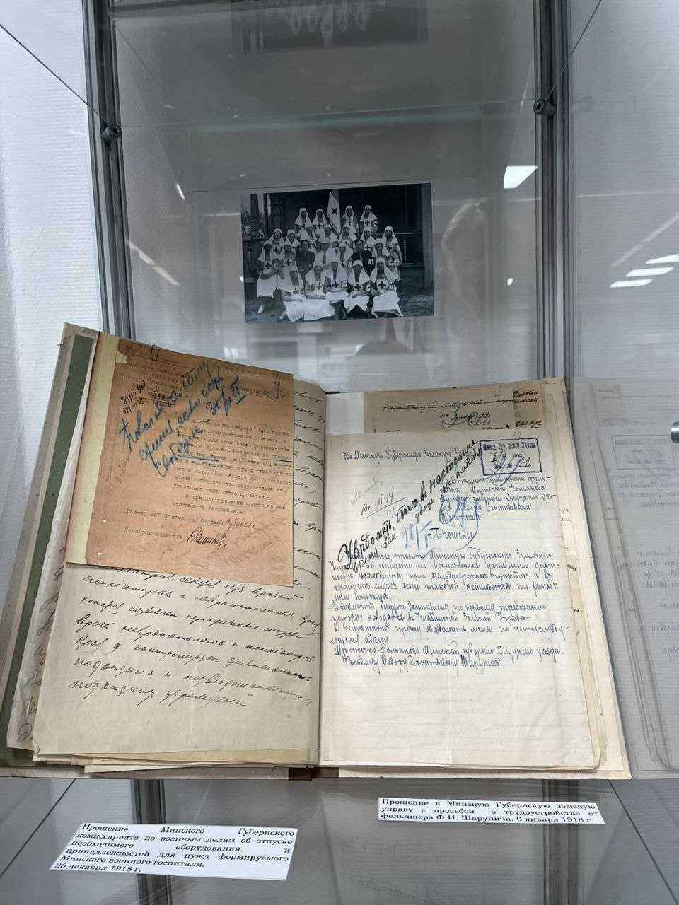 На выставке представлены архивные документы из фондов НАРБ: декрет СНК РСФСР о мерах борьбы с эпидемиями в 1919 году; приказы по Минскому Губернскому отделу здравоохранения; регистрационная книга инфекционных заболеваний по городу Минску за 1918 - 1920 гг.; положение Всероссийского союза работников лечебно – санитарного дела о нормальных аптечных штатах; штаты местных отделов здравоохранения на 1920 г., и другие документы.