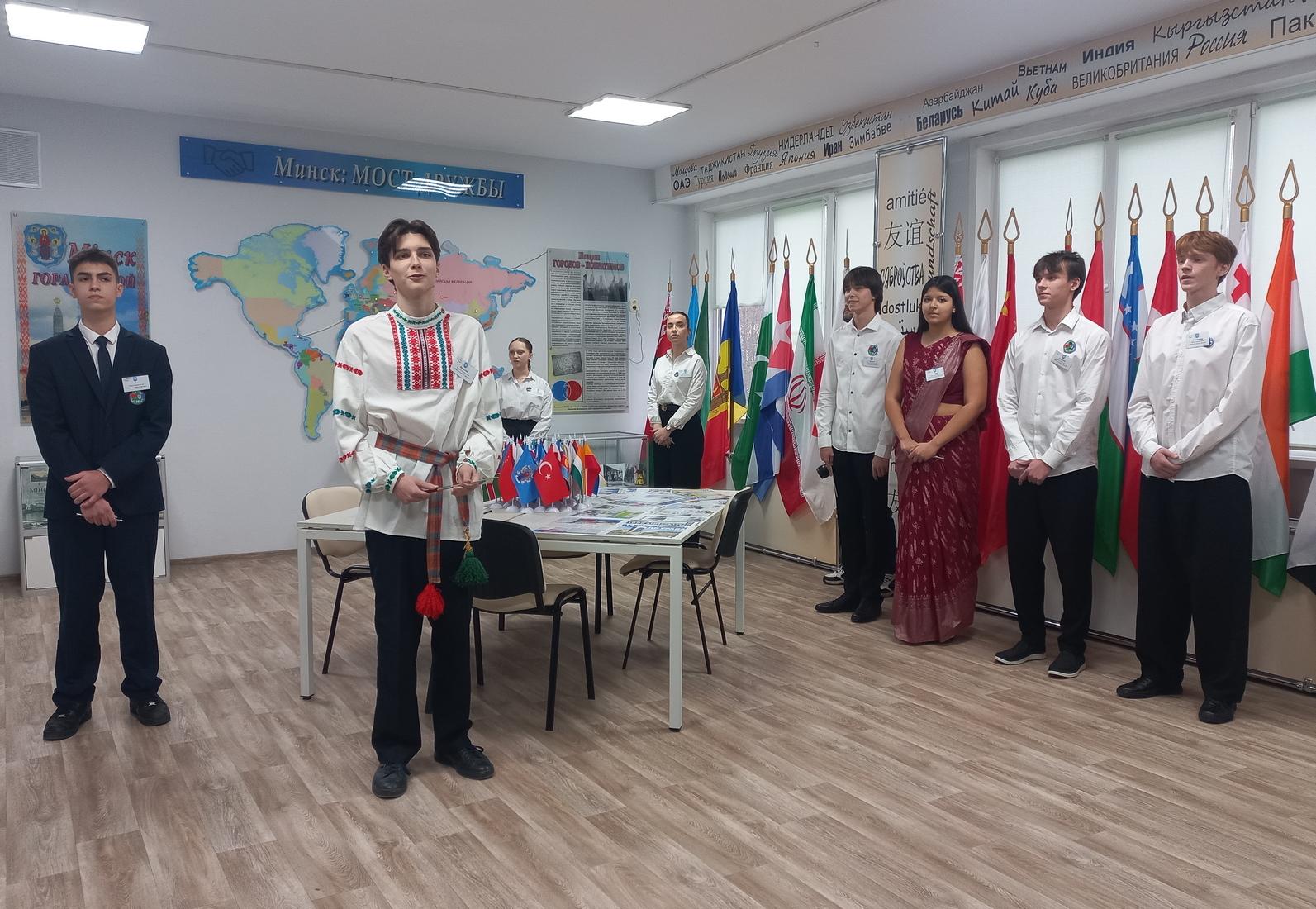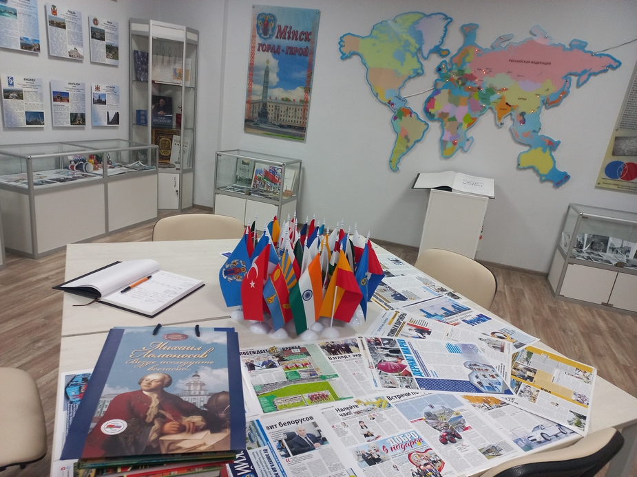 В экспозиции музея представлены национальные костюмы, сувениры, полученные в дар от иностранных делегаций, национальные символы городов-побратимов, литература о различных странах мира, а также документы и фотографии Национального архива Республики Беларусь и Белорусского государственного архива кинофотофонодокументов.