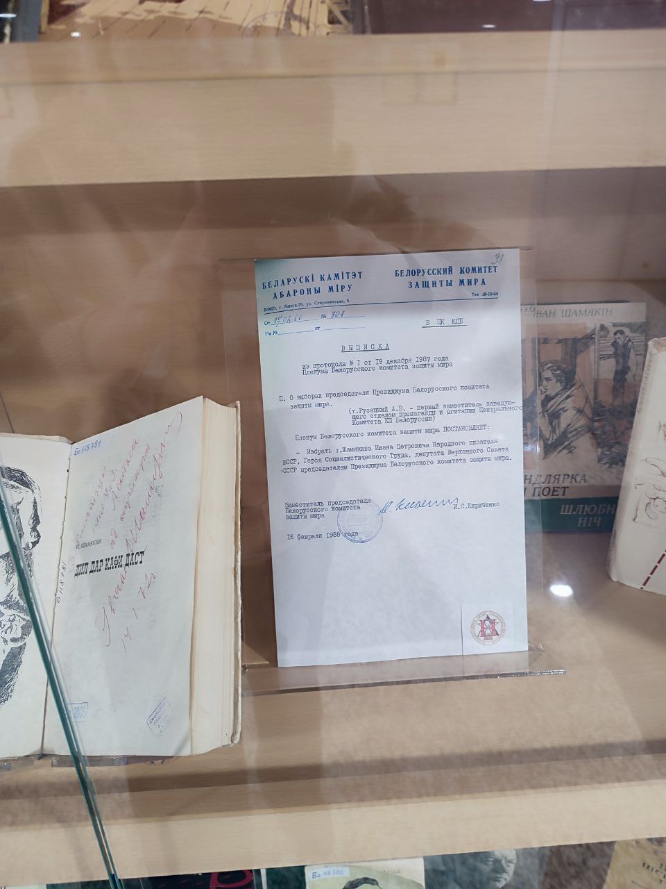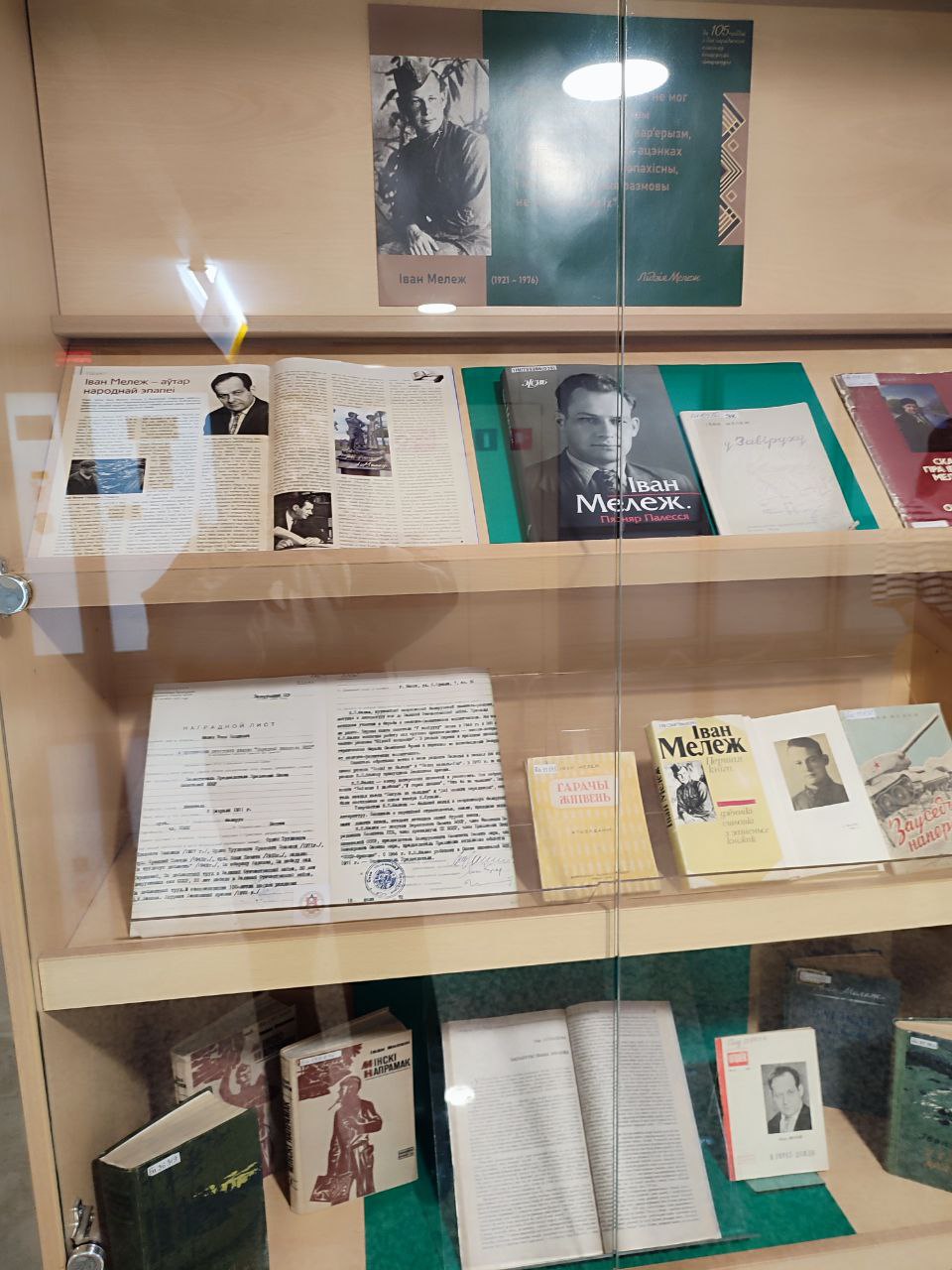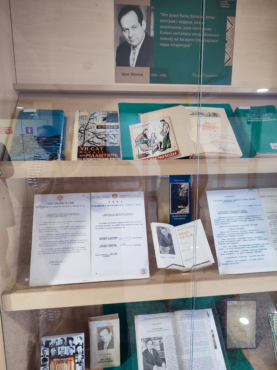 В экспозиции представлены копии документов из фондов НАРБ, свидетельствующие об их чрезвычайно активной и многогранной деятельности и общественно-политической жизни: Постановление ЦК КПБ и Совета Министров БССР о присуждении Государственных премий БССР; Указ Президиума Верховного Совета БССР о присвоении И.П.Мележу почетного звания Народного писателя БССР в 1972 г.; Постановление Верховного Совета Белорусской ССР об избрании И.П.Шамякина Председателем Верховного Совета Белорусской ССР; личное дело И.П.Шамякина и другие документы. Многие материалы демонстрируются впервые.