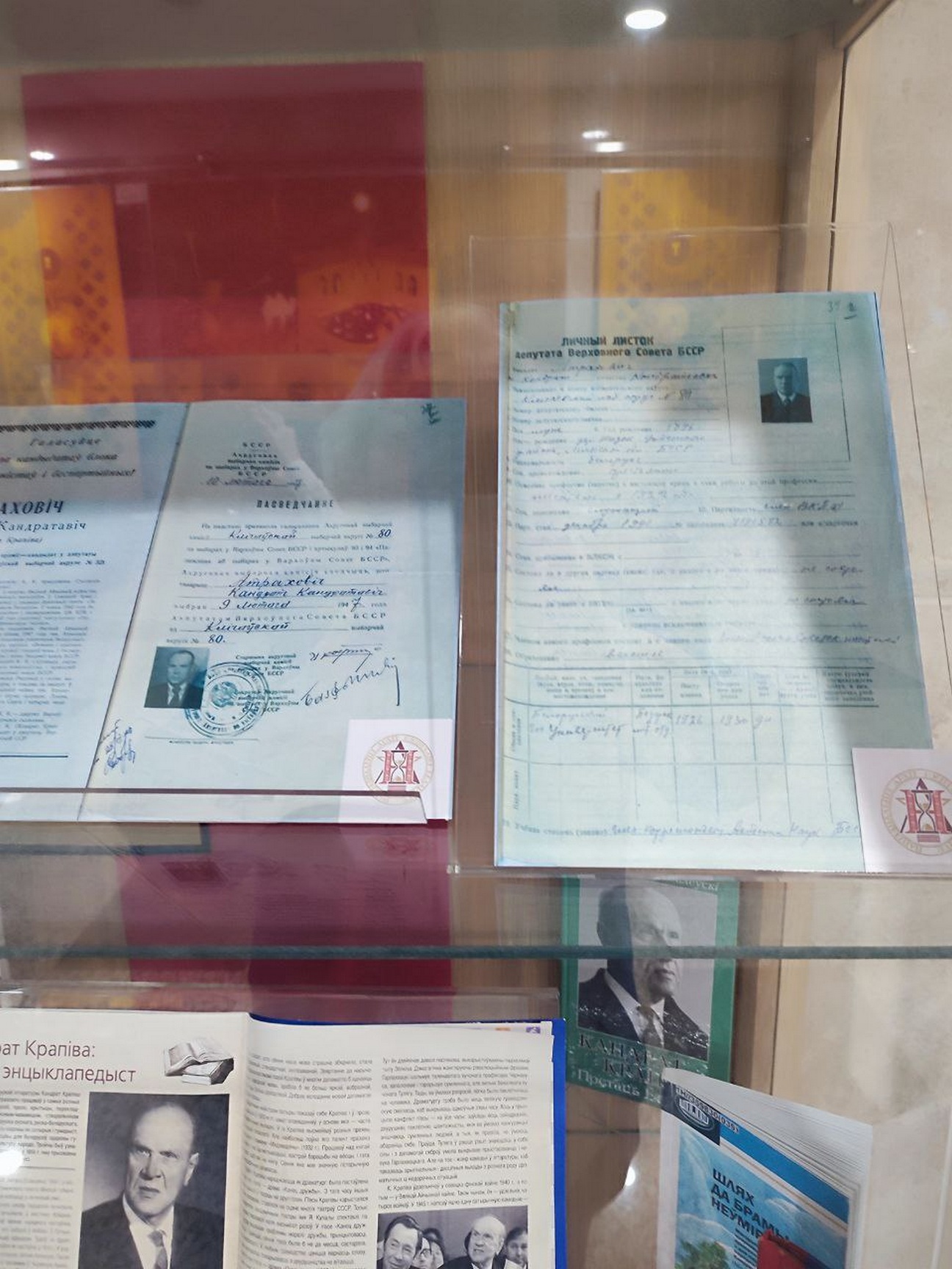 НАРБ на выставке представил наиболее интересные и значимые документы из архивных фондов. Это материалы, связанные с государственной и партийной деятельностью К.К.Крапивы (Атраховича): Постановления Президиума ЦК КПБ, протоколы заседаний Бюро ЦК КПБ о его назначениях, приказ Верховного Совета ССР о награждении медалью «Партизану Отечественной войны» 1-й степени, плакаты-биографии кандидата в депутаты Верховного Совета БССР К.К.Атраховича, свидетельство об избрании его депутатом Верховного Совета БССР, личный листок депутата Верховного Совета БССР К.К.Атраховича (Крапивы), фотографии членов делегации БССР на конференции Организации Объединенных Наций в Сан-Франциско. Посетители выставки смогут увидеть личное дело студента педфака БГУ К.К.Атраховича (Крапивы), датируемое 1925 годом, с автобиографией, свидетельством о рождении и фотографией тех лет.