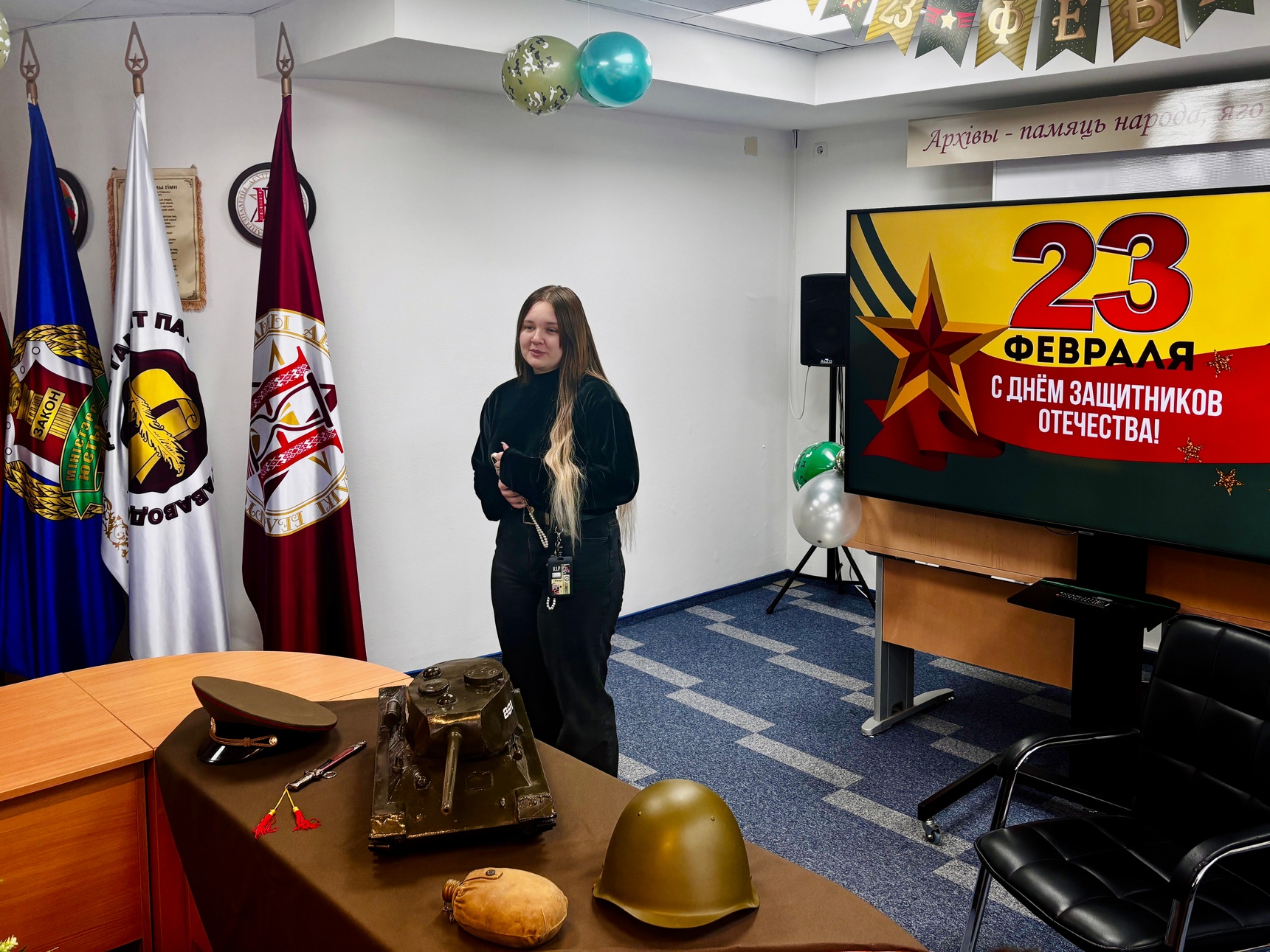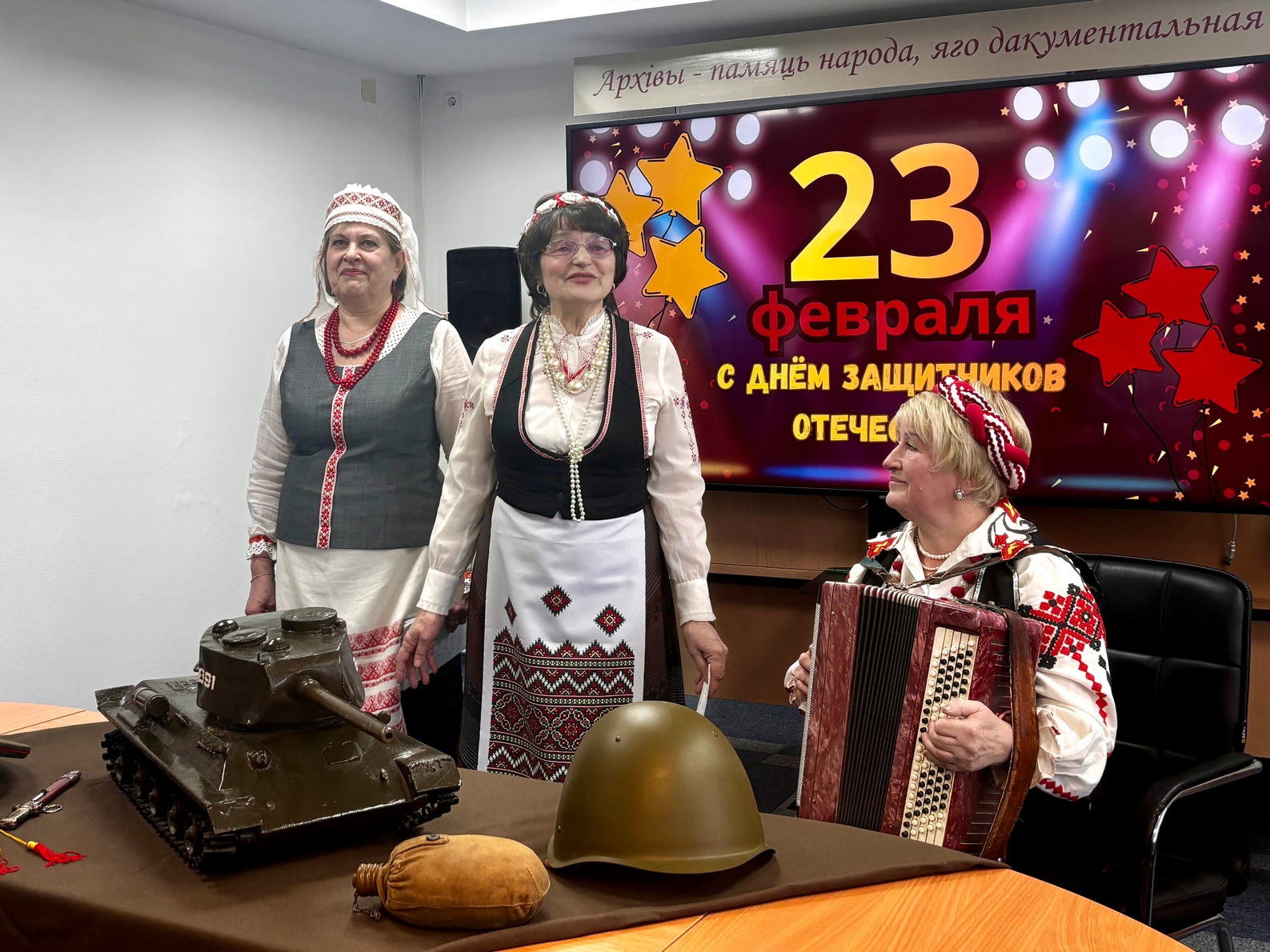 Утро в архиве началось с концерта, организованного силами музыкального коллектива «Кумушки». Для мужчин были исполнены патриотические, военные и тематические песни, посвященные защитникам Отечества.