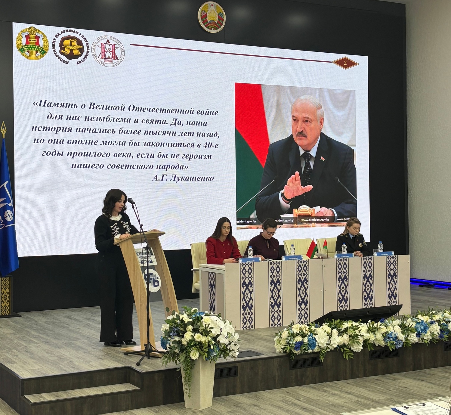 В своем выступлении спикер отметила, что история Великой Отечественной войны занимает особое место в нравственной и культурной конструкции нашего государства и нашего народа. В Главном законе Республики Беларусь – Конституции – указано, что «Государство обеспечивает сохранение исторической правды и памяти о героическом подвиге белорусского народа в годы Великой Отечественной войны». Также в статье 54 Конституции Республики Беларусь закрепляется положение о том, что «Проявление патриотизма, сохранение исторической памяти о героическом прошлом белорусского народа являются долгом каждого гражданина Республики Беларусь».