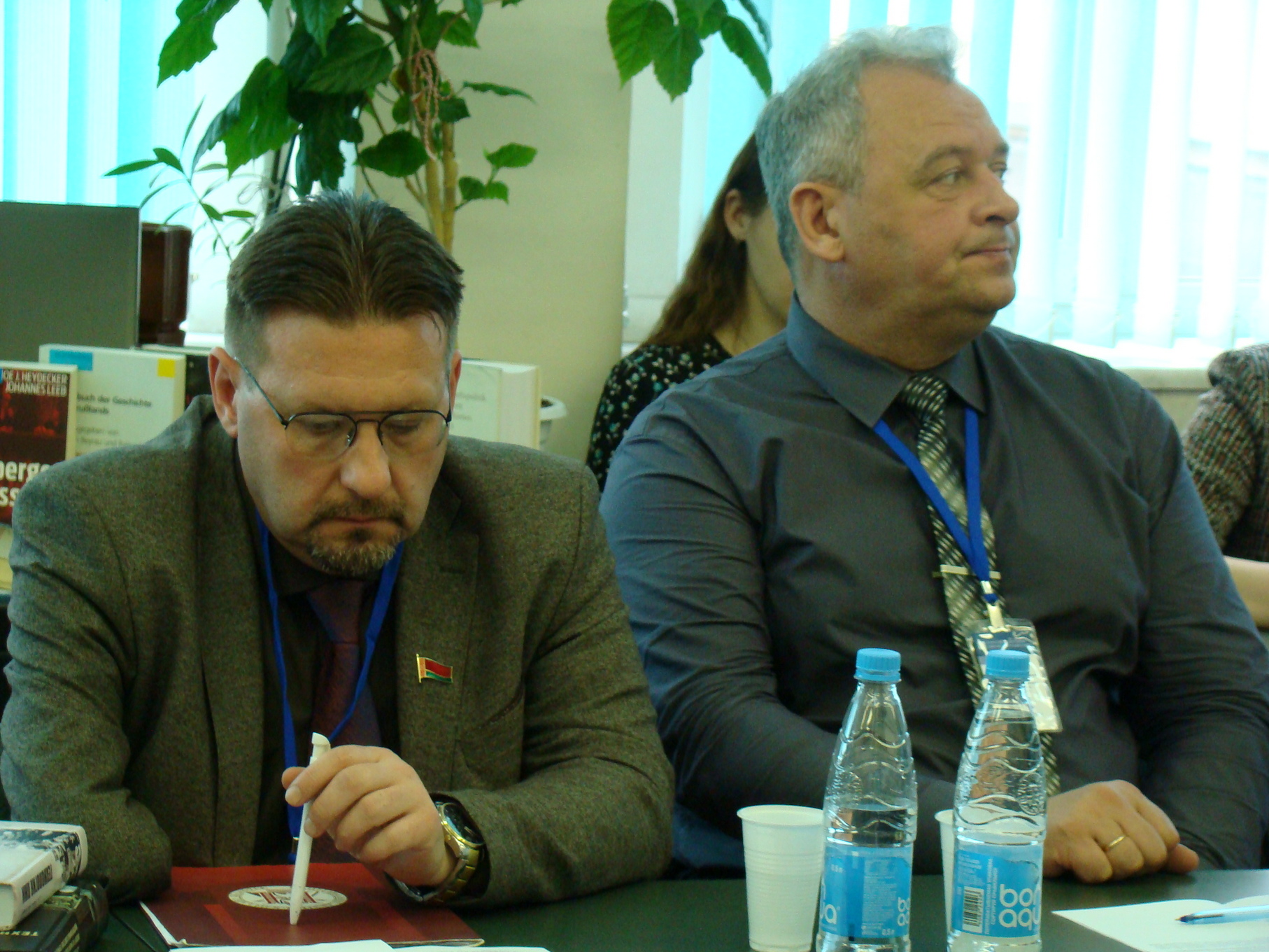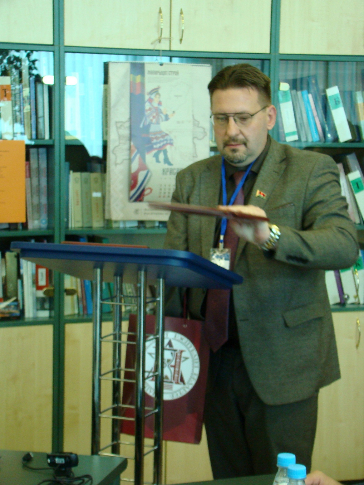 Заместитель директора Национального архива Республики Беларусь (далее – НАРБ), к.и.н. С.В.Кулинок зачитал поздравительный адрес от руководства НАРБ, вручил Благодарность НАРБ заведующему кафедры истории и социальных наук А.Г.Цымбалу, а также передал в библиотеку университета издания архива.