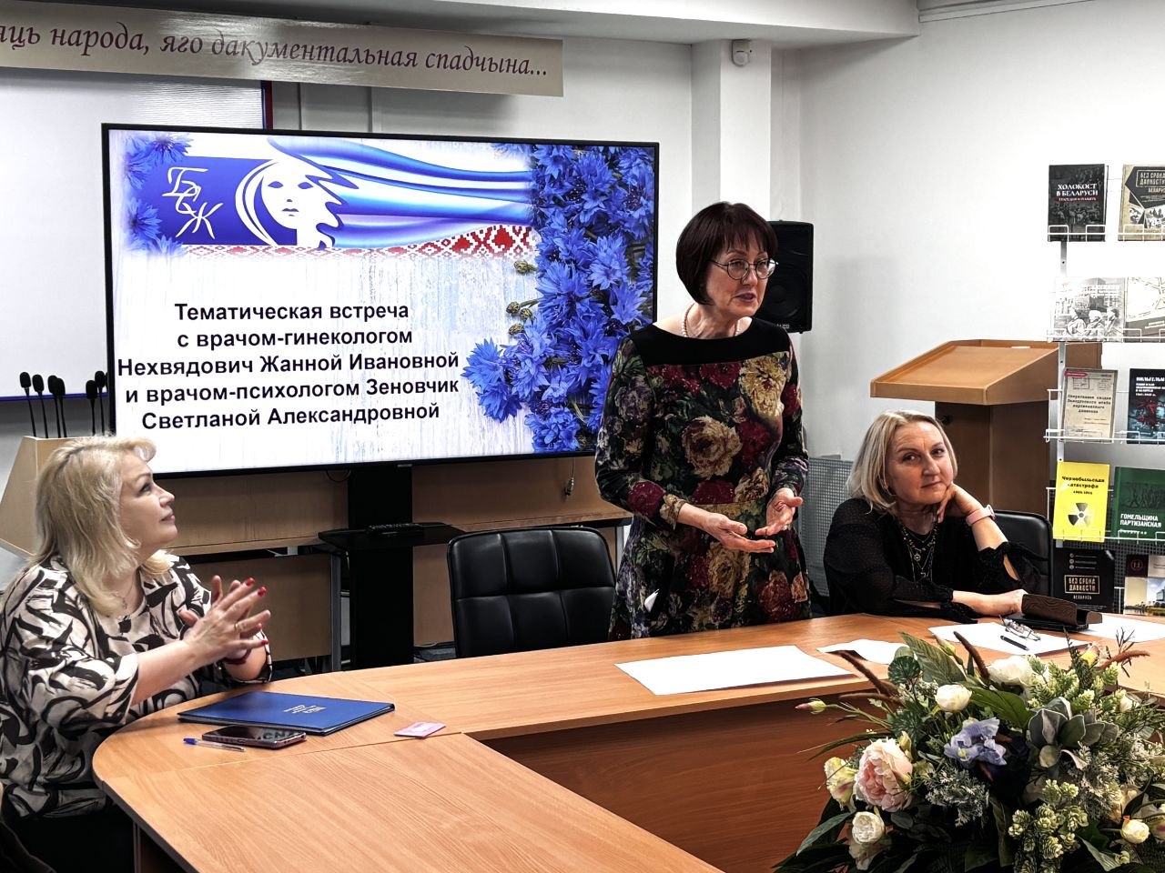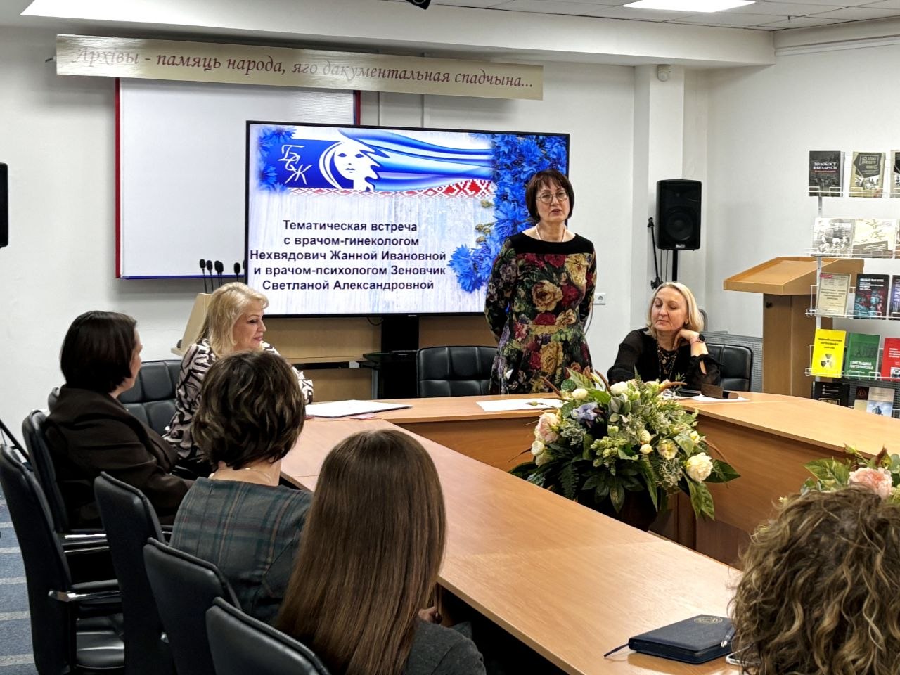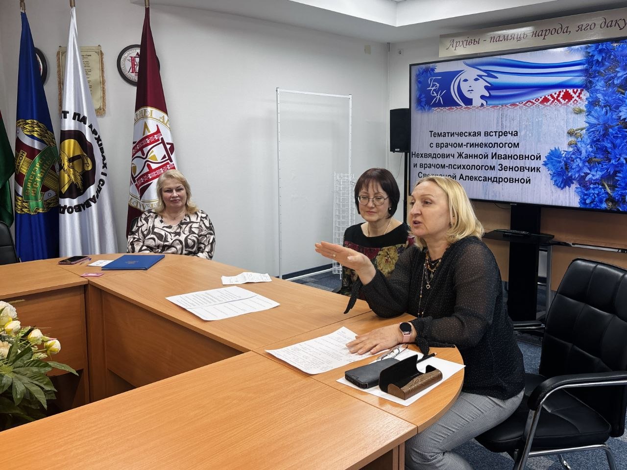 08.04.20267 апреля 2026 года первичной организацией ОО «Белорусский союз женщин» Национального архива Республики Беларусь была организована тематическая встреча с врачом–гинекологом, заведующим женской консультацией 23-й городской поликлиники г. Минска Жанной Ивановной Нехвядович и психологом Светланой Александровной Зеновчик. В ходе встречи прошла интересная беседа, касающаяся женского здоровья. Внимание слушательниц заострялось на главных духовных ценностях человека во взаимоотношениях противоположных полов – уважении и любви. Жанна Ивановна и Светлана Александровна также ответили на вопросы женщин архива.